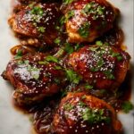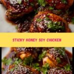 This Sticky Honey Soy Chicken recipe features tender, juicy chicken thighs or drumsticks baked to perfection with a sweet and savory glaze made from honey, soy sauce, garlic, and a touch of vinegar. The chicken is baked until perfectly browned and sticky, then garnished with sesame seeds and fresh coriander for a deliciously flavorful meal that’s perfect served with rice and steamed greens.