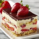 This Strawberry Eclair Cake is a delightful no-bake dessert featuring a buttery graham cracker crust layered with a creamy vanilla pudding and fresh strawberries, topped with a rich chocolate glaze. Perfect for summer gatherings or anytime you crave a refreshing, indulgent treat without the need for an oven.