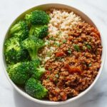 These Sweet & Spicy Ground Turkey & Broccoli Bowls are a quick and flavorful meal perfect for busy weeknights. Ground turkey is cooked to juicy perfection and simmered in a tangy sauce made from sweet chili sauce, honey, Sriracha, soy sauce, sesame oil, garlic, and ginger. Steamed broccoli and fluffy cooked brown rice complete this balanced bowl, which can be garnished with sesame seeds and green onions for an added crunch and freshness.
