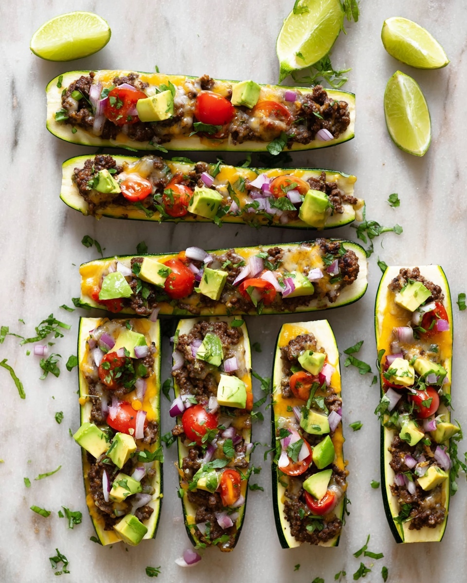 Taco Zucchini Boats are a delicious and healthy twist on traditional tacos, featuring hollowed-out zucchini filled with seasoned ground beef, topped with melted Mexican cheese, and fresh toppings like avocado, tomato, and cilantro. This low-carb, flavorful dish is perfect for a quick weeknight dinner or a fun family meal.