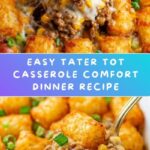 This comforting Tater Tot Casserole combines savory ground beef, creamy mushroom soup, corn, sour cream, and cheddar cheese, all topped with crispy baked tater tots. Perfect for a family dinner, this hearty casserole is easy to prepare and delivers a deliciously satisfying meal.