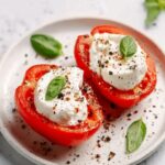 Sprinkle salt and pepper evenly over the tomato and burrata layers to enhance their natural flavors. Then, tuck fresh basil leaves on top or slightly underneath the cheese. The fresh green basil adds a lovely aroma and a peppery undertone that balances the richness.