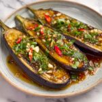 Vietnamese Grilled Eggplant with Scallion Oil is a quick and flavorful appetizer featuring tender, charred eggplants topped with a fragrant scallion oil infused with soy sauce and a hint of sweetness. This simple yet aromatic dish is perfect for a light meal or as a side dish, showcasing the smoky richness of grilled eggplant combined with savory scallion oil.